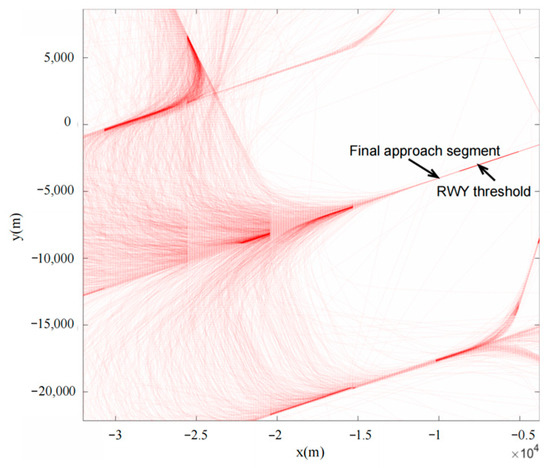 Taking Chengdu ZUUU Airport as an example, where performance-based navigation (PBN) flight procedures are implemented, a schematic diagram of the precision approach procedure within the framework of PBN for Runway02L is shown in Figure 7. Based on ADS-B arrival data from four months in 2022, a total of 5000 arrival trajectories for Runway02R were identified and analyzed, as illustrated in Figure 8. The trajectory data contain various operational parameters of the aircraft, including flight number, longitude, latitude, altitude, speed, heading, aircraft type, and timestamp. Since the raw trajectory data contain noise and lacks standardized formatting, preprocessing is necessary to ensure a more precise analysis of sector traffic flow characteristics. The preprocessing steps primarily involve trajectory data selection, the removal of duplicate trajectories, and the filtering of erroneous data points.