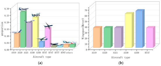 (a) Proportion distribution of aircraft models; (b) wingspan length.