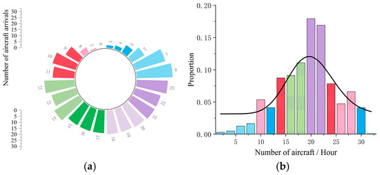 (a) The number of flights corresponding to each hour of the day; (b) histogram of hourly aircraft arrivals with a fitted Poisson distribution curve.