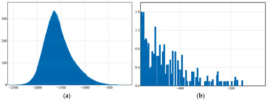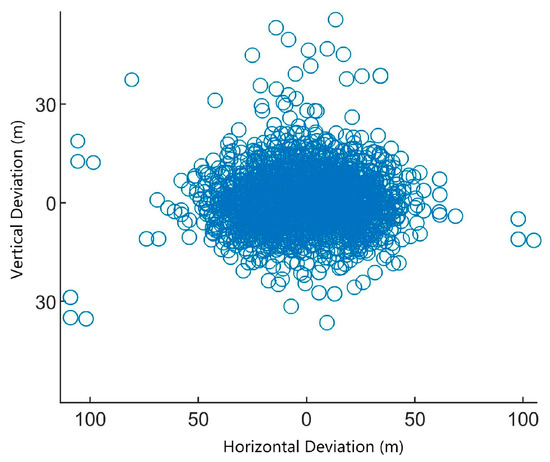 The collision risk of an aircraft during the approach phase is related to its actual position relative to the nominal glide path. The actual flight trajectory is influenced by various factors, including navigational and human factors. Therefore, the trajectory generated by simulation must account for approach deviation performance. Trajectory cross-sections are established at 1000 m intervals along the approach path, extending in the opposite direction from the runway threshold. At the final approach phase, all trajectory points within a given section are identified based on the intersection between the actual trajectory and the cross-section. Outliers detected using the Grubbs test criterion are removed. The lateral and vertical deviations are determined by comparing the identified trajectory points with the corresponding nominal trajectory points in each cross-section. Figure 11 illustrates the deviation of trajectory points from the nominal trajectory at the 6000 m cross-section. A study conducted by TU Dresden indicates that a normal distribution function is the most appropriate for describing the statistical characteristics of approach and departure procedures [36]. Therefore, the deviations are assumed to follow a normal distribution.