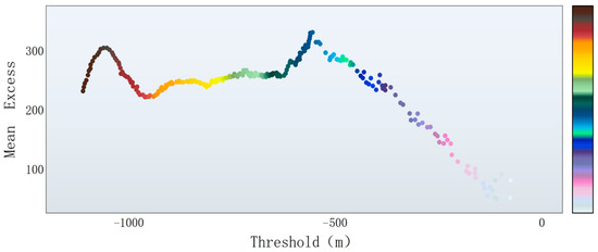 In the equation, are independent and identically distributed samples; I is the indicator function; if Xi > u, then I{Xi > u} = 1; otherwise, I{Xi > u} = 0. The mean excess plot consists of points {(X(i), en(X(i)):1 ≤ I ≤ n−1}, where Xi represents the ith statistical sample, and n denotes the total sample size. Typically, the threshold is selected as the smallest value at which the mean excess function plot exhibits an approximately linear behavior. Such linearity suggests that the generalized Pareto distribution provides a suitable approximation for the tail distribution exceeding the chosen threshold.