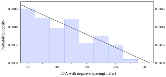 Once the threshold u is determined, extracting situations where the CPA interval exceeds the threshold u and satisfies GPD. Subsequently, the maximum likelihood estimation (MLE) technique is employed to estimate the GPD parameters. It is assumed that complete overlap (dCPA = 0) is possible, implying that the GPD range lies between u and 0, with the following relationship: ξ < 0, β = −ξ u, Therefore, only ξ needs to be estimated. With the estimated GPD parameters, the risk probability can be computed. Given that the CPA distance is below the threshold u, the probability of collision can then be derived using Equation (14).