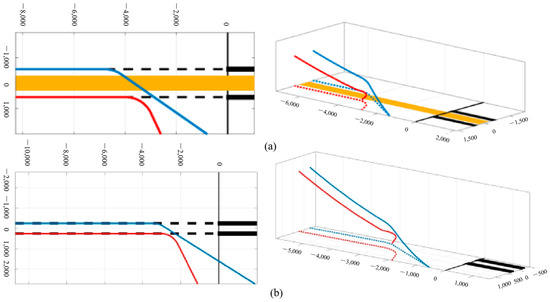 The distribution of cross-sections is illustrated in Figure 12. It can be observed that trajectory deviations are correlated with the distance from the runway threshold—the farther the distance, the larger the standard deviations in both lateral and vertical directions. Additionally, in the lateral direction, flight trajectories exhibit minor oscillations around the nominal glide path. In the vertical direction, the mean value of the cross-section is higher than that of the nominal trajectory. This phenomenon occurs because, during the approach phase, aircraft tend to maintain a slightly higher altitude than the nominal glide path as a safety precaution.