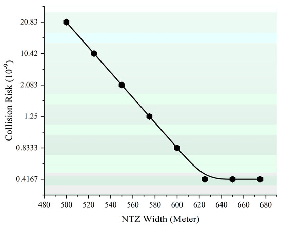 According to the simulation results in Figure 18, as the runway spacing increases, the collision risk decreases. The NTZ with a width of 610 m provides a margin for further reduction. An additional experiment was conducted to evaluate different NTZ widths ranging from 500 to 650 m for a runway centerline spacing of 1300 m. The results indicate that under the safety target level, the NTZ width can be reduced to 530 m.