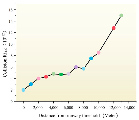 The experimental results are presented in Figure 19, which illustrates that the closer the deviation point is to the runway threshold, the lower the associated risk. This finding is generally consistent with the characteristics of approach deviation characteristics.