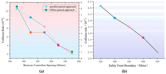 The results of Figure 20a indicate that the offset approach significantly enhances approach safety. Specifically, for a runway centerline separation of 365 m, the minimum safety threshold under the 3° offset paired approach was 400–450 m.