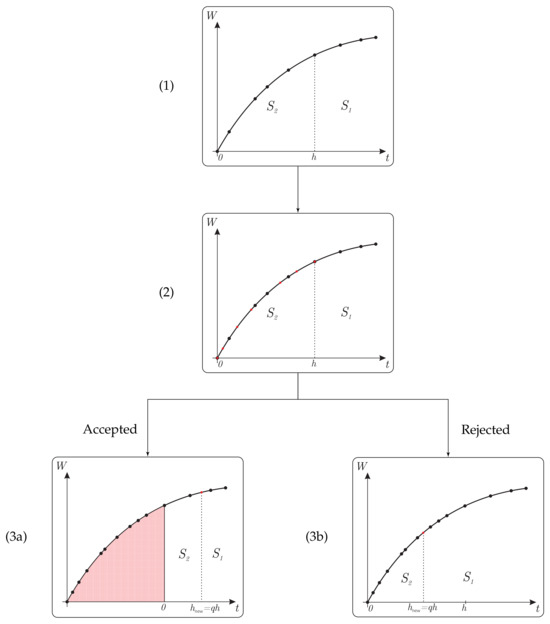 - If , the step is rejected:The information from within the new step length is moved onto , and the element associated with the end of the new step is added on top of by interpolating its last element with the first element of .