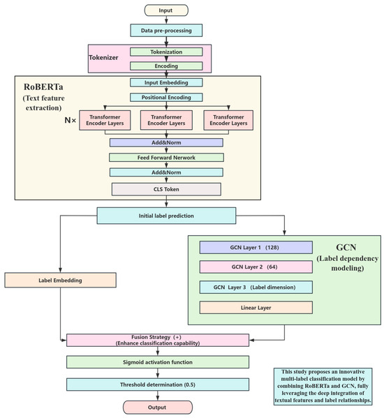 After introducing the GCN module, the average precision of the RoBERTa + GCN model is further improved to 0.8702, and the average recall rate is improved to 0.9623. Compared with RoBERTa and RoBERTa + FC, the GCN module exhibits distinct advantages in improving the model performance. Through the multi-layer graph convolution operation, GCN effectively captures the high-order dependencies among labels and enhances the classification ability of the model in comprehending the complex relationships in multi-label tasks. By modeling the complex relationships between labels, the GCN module improves the adaptability of the model to the diversity of label combinations. Consequently, this leads to an improvement in the classification performance.