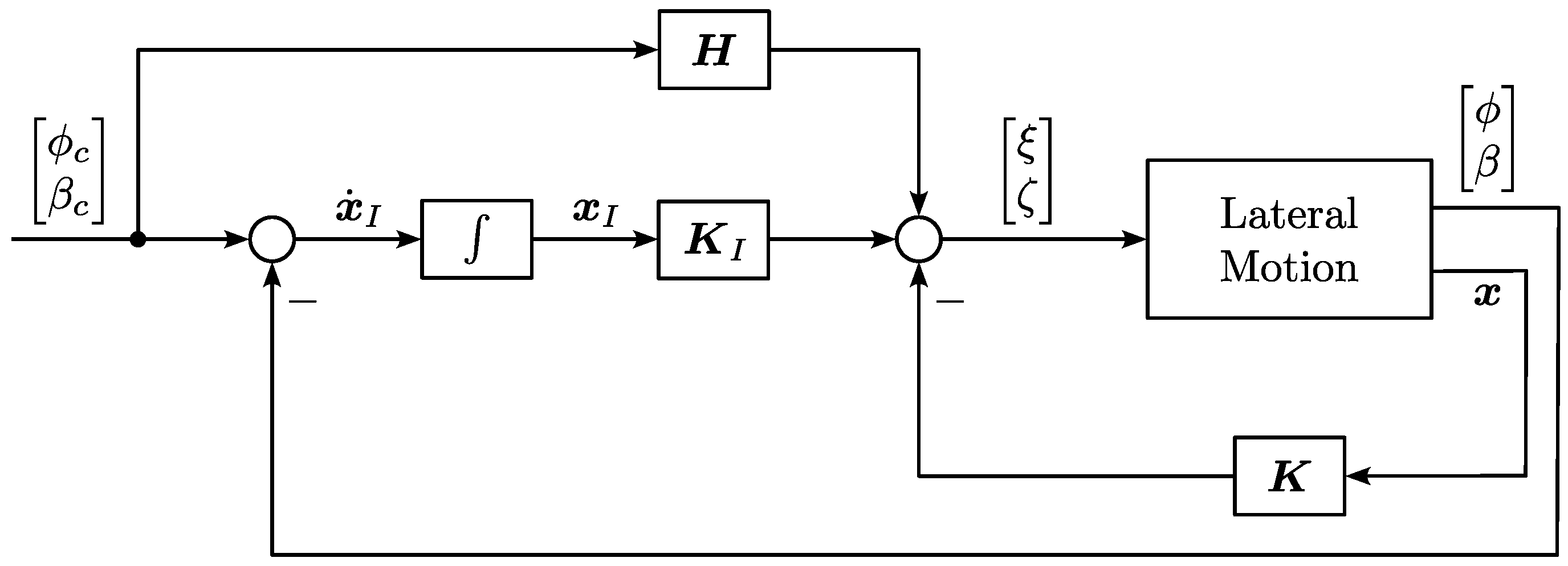 where , , and represent the gain matrices for the state feedback, integral, and feedforward, respectively. It is an integrated design for both the short-period mode and phugoid mode. The state feedback improves system dynamics, the integrator eliminates steady-state error, and the feedforward term enhances tracking performance. Additionally, turn compensation is given by: