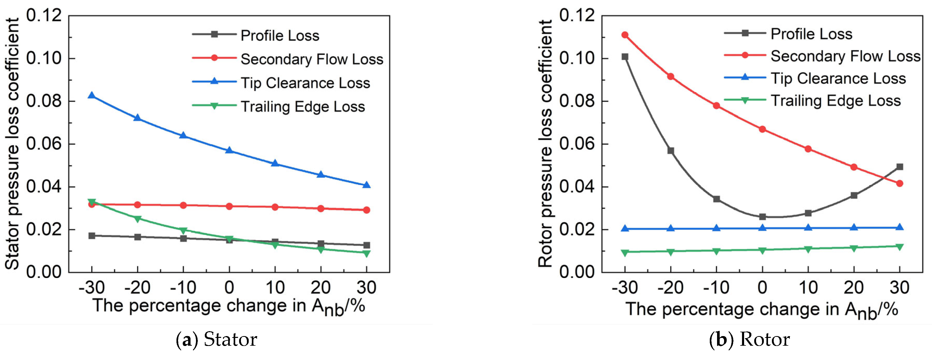 - Both opening and closing Anb will cause a decrease in turbine efficiency and closing Anb causes a greater decrease in turbine efficiency. The change in mass flow rate is smaller than the change in Anb. When the pressure ratio is 1.75, the Anb of the single-stage turbine is closed by 30%, the efficiency decreases by 6.932%, and the mcor decreases by 25.67%; when Anb is opened up by 30%, the turbine efficiency decreases by 3.148% and mcor decreases by 19.48%. When the design total-to-static pressure ratio is 4.76, the Anb of the five-stage turbine is opened up by 20%, the turbine efficiency decreases by 0.116% and the m increases by 4.62%; when Anb is closed by 20%, the turbine efficiency decreases by 1.653% and m decreases by 10.10%.