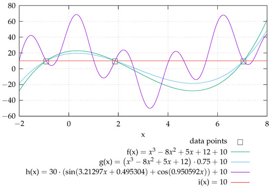 For real-world applications, the number of data points, and therefore the number of test points, is limited. If these are used to evaluate the model accuracy, this is always a discrete test. For continuous functions, the behaviour between these points remains untested. This is illustrated in Figure 1. All graphs pass through the data points, but have a different behaviour in between. Based on the data points, it cannot be decided which formula models the behaviour correctly. Adding data points only reduces the interval size where the true behaviour is unknown. This variety can also be described as there are many distinct models that solve the problem equivalently, which is identified as “underspecification” in ML pipelines by D’Amour et al. [19]. For derivated models, this is not a problem as the behaviour is justified by the derivation. Also, limitations or assumptions are made explicitly and are therefore known in detail.
