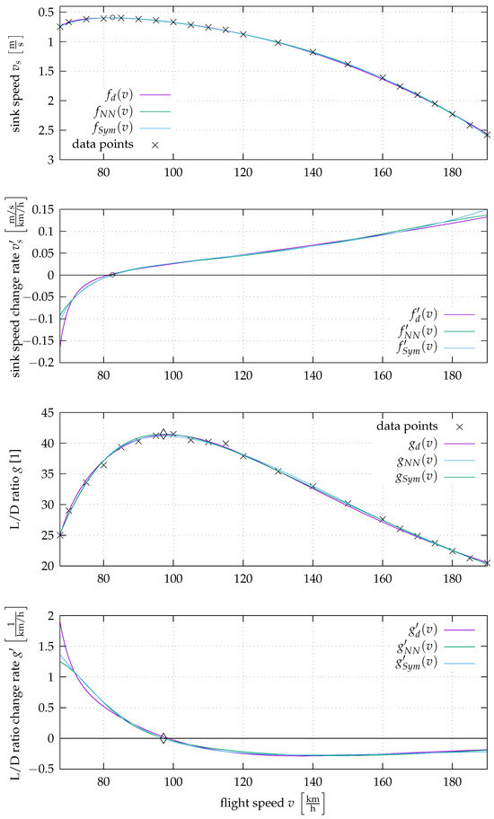 The result values are shown in Figure 2. The data points are marked by black crosses (×) and the models, as well as their derivatives, in violet for , in green for , and in blue for . In the top diagram, the rate of descent is plotted against the airspeed. This is the typical representation for an aircraft polar. In the second top diagram, the rate of change of the sink rate is plotted against the airspeed. The third diagram from above shows the glide ratio and the bottom diagram shows the rate of change of the glide ratio over the airspeed. This illustration makes it easy to visually understand the relationship between sink rate, glide ratio, and airspeed. In addition, the extreme points can be identified by visualising the derivatives.