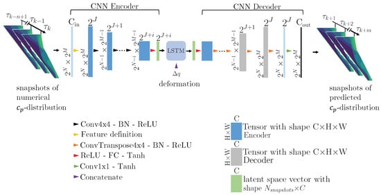 In addition to the application of POD and DMD, convolutional neural networks (CNNs) and autoencoder structures are applicable for the computation of the spatial characteristics of high-dimensional flow field data and data reduction, respectively. Studies by Afshar et al. [] and Sekar et al. [] applied a CNN-based ROM for the computation of the flow and pressure field around an airfoil in transonic flow. Besides the application of a single CNN structure, recent studies proposed hybrid deep learning models based on CNNs and recurrent neural networks (RNNs). Li et al. [] used a convolutional long short-term memory (ConvLSTM) neural network for flow field prediction through cascade channels. Hasegawa et al. [] proposed a hybrid ROM based on a series connection of a convolutional autoencoder (CNN-AE) and a LSTM for unsteady flow field prediction. The proposed method was also used by Nakamura et al. [] for turbulent channel flow prediction. Liu et al. [] used a hybrid CNN-ConvLSTM for buffet flow field computation around an airfoil.