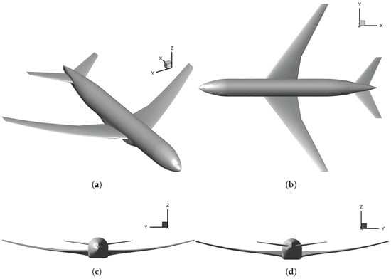 As a test case for the following investigations, the NASA CRM is applied. The configuration investigated in the present study represents a wing/body model with a horizontal tail plane. The design cruise condition is defined by a Mach number of and a lift coefficient of . For the following studies, both half- and full-span models of the CRM configuration are simulated for the buffet condition. In Figure 4, the geometry of the full-span model is visualized using isometric, top, front and back views.