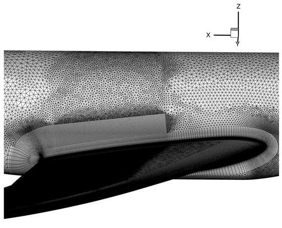 The grid of the half-span model is composed of approximately elements, whereas the full-span model includes around elements. Both grids are composed of unstructured cells in the farfield and structured cells around all surfaces with a proper boundary layer resolution with a minimum wall distance of the first cell of < 1. In addition, a refinement block containing uniform hexahedral elements is defined above the boundary layer elements on the wing’s suction side, in order to ensure a sufficient spatial resolution of the area of shock motion and flow separation (see Figure 5). The cell size of the block is defined according to a CFL (Courant–Friedrichs–Levy) number of 1.
