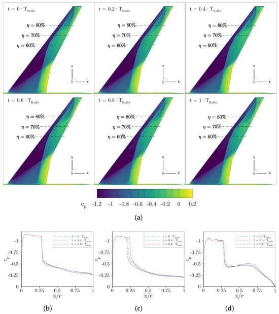 Pressure coefficient () contour plots showing the buffet cycle of the NASA CRM ( = , , ). refers to the buffet period. (a) Full buffet cycle. (b) Surface pressure coefficient at . (c) Surface pressure coefficient at . (d) Surface pressure coefficient at .