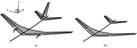 For modeling the eigenmode-based structural deformations, the FERMAT configuration proposed by Klimmek [] is applied. The finite element model (FEM) was developed in order to allow static and dynamic aeroelastic investigations on the basis of the CRM geometry, referring to a full-scale aircraft. The FERMAT model allows for the representation of two different setups, namely the C1 case representing the maximum zero fuel weight configuration and the C2 case, defining the configuration with maximum take-off weight. For the following investigation, the C2 mass configuration is applied. The C2 configuration includes in total 56 modes, representing six rigid body and 50 elastic modes.