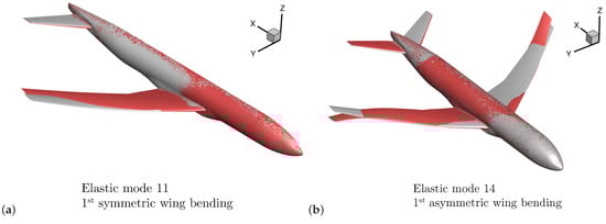 with defining the maximum deflection amplitude of the considered mode and f denoting the reference scaling factor, which is chosen as f = 0.01 (1%). The factor is chosen in order to guarantee stable numerical simulations. In Figure 9, the considered mode shapes are visualized in comparison to the original CRM geometry. Here, an increased deflection is shown for clarity.