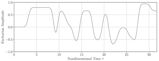 For the generation of the training and validation data sets, forced-motion CFD simulations are performed. For the time-based excitation of the mode shapes, a smoothed amplitude-modulated pseudo-random binary signal (SAPRBS) [] is generated and applied. This signal type is used, since it is characterized by a high frequency and amplitude content, making it suitable for time and cost consuming simulations. The generated signal is depicted in Figure 10, including 2000 time steps.
