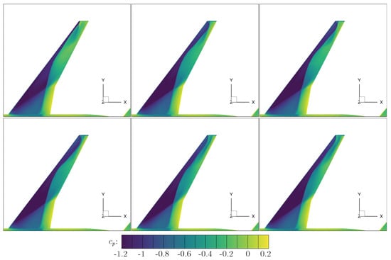 In Figure 14, the wing pressure distribution due to mode shape 11 in combination with the SAPRBS excitation is depicted at two individual time steps. Comparing the reduced spatial resolution with the original resolution visualized in Figure 11, a high level of spatial resolution is maintained. The characteristic -shaped two-shock pattern and changes in the spanwise pressure distribution, in particular in the mid-span and tip region, are still clearly visible.