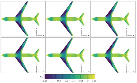 For all simulations, the minimum and maximum excitation amplitude of the signal are chosen to equal a reference scaling factor of f = 1%. Due to the excitation and the resulting structural deflection, clear changes in the surface on the wing suction side result. In Figure 11 and Figure 12, six consecutive -snapshots are visualized for the SAPRBS excitation of mode shapes 11 and 14, respectively.
