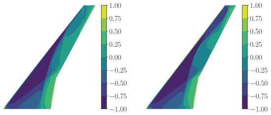 In addition to the performance evaluation by means of comparing the chordwise -distribution, a comparison of the surface is provided for both test cases at the considered time step t = 2 (see Figure 20 and Figure 21). In Figure 22 and Figure 23, a comparison of surface for the mode 11 test cases with f = 1% and f = 0.5% is visualized, respectively. In Figure 24 and Figure 25, the corresponding surface distributions of mode shape 14 for both test cases are compared to the reference CFD solution. As shown in Figure 22, Figure 23, Figure 24 and Figure 25, the hybrid ROM is able to capture the -distributions to a sufficient extent. Moderate deviations in the overall MSE are indicated, which correspond to the results presented in Figure 20 and Figure 21.