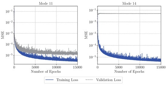 Prior to the training, the data set is split into training and validation data sets. Therefore, 80% of the -snapshots are used for training, whereas the remaining 20% are applied for validation and hyperparameter tuning. Based on a detailed parameter study, the following optimal hyperparameters have been identified: The CNN-AE is trained on batches, including 32 -snapshots each. For both the encoder and decoder, four convolution levels are applied. Considering both the data representing the symmetric and asymmetric mode shape related pressure distributions, the spatial resolution of the input data is reduced from to and to , respectively. The channel size is increased from 3 to 512. By passing the FC layer, the latent size is reduced from 512 and 1024 to 256 features, respectively. The initial learning rate is defined as and the training of the CNN-AE is terminated after 15,000 epochs. During the training, the mean squared error (MSE) between the reference numerical data and the corresponding predictions is minimized. In Figure 15, the trends of the training and validation losses of the CNN-AEs for mode 11 and 14 are visualized, respectively. As shown, the training and validation loss of mode 11 show clear convergence trends, while the validation loss of mode 14 stays constant after an initial number of epochs.
