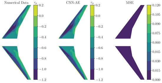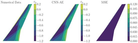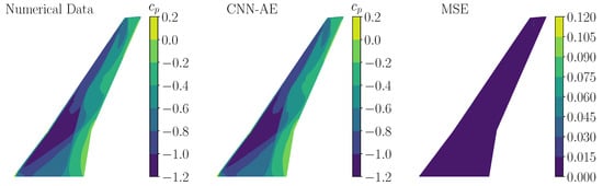 In the first step, the trained CNN-AEs are applied in order to reconstruct pressure distributions due to the harmonic excitation. In Figure 19, a comparison between a numerical -snapshot (left) and the corresponding, reconstructed -snapshot (middle) for mode shape 11 is visualized. Here, an excitation amplitude equal to f = 1% is considered. As shown, a good performance capability of the trained CNN-AEs is indicated by an overall small MSE on the wing suction side.