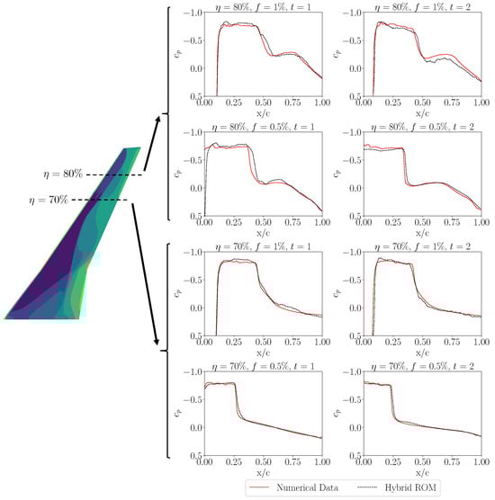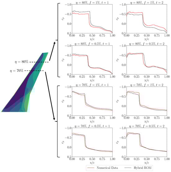 In order to evaluate the performance of the hybrid ROM, chordwise -distributions as modeled by the hybrid ROM are compared to the reference numerical -distributions. Therefore, two different spanwise positions = [70%, 80%], which indicate distinct differences in the pressure distribution, are considered. The -distributions are defined at two different time steps included in the multi-step predictions. It has to be mentioned that, for mode shape 14, only the wing starboard side is considered. In Figure 20 and Figure 21, a comparison of the modeled and simulated -distributions for mode shapes 11 and 14 are visualized, respectively. As shown in Figure 20, the hybrid ROM is able to capture the trends of the pressure distribution of mode 11 at both spanwise positions. However, moderate deviations in the shock position are indicated, especially as the time step of the multi-step prediction advances. Focusing on the data comparison of mode 14 provided in Figure 21, larger deviations, especially in the level of shock intensity, compared to the mode 11 test case are shown. Similar to the predictions of mode 11, the -distributions at the advanced time step define a challenge for the hybrid ROM. The exact cause of the larger deviations observed for mode 14 could not be clearly identified; however, one possible explanation is the more complex structural deformation associated with this mode. As shown in Figure 9, the asymmetric wing bending mode may be more challenging for the hybrid ROM to accurately capture, although further investigations are required to confirm this hypothesis. Additionally, once the model uses its own predicted snapshots as input instead of numerical reference data, errors can accumulate and the rate of deviation may increase to some extent due to the propagation of artificial inputs. However, although deviations between the CFD and the hybrid ROM solutions are indicated, the overall trend of the shock position and the overall spanwise -distribution are captured by the proposed ROM.
