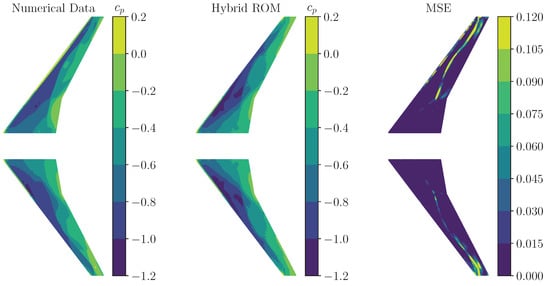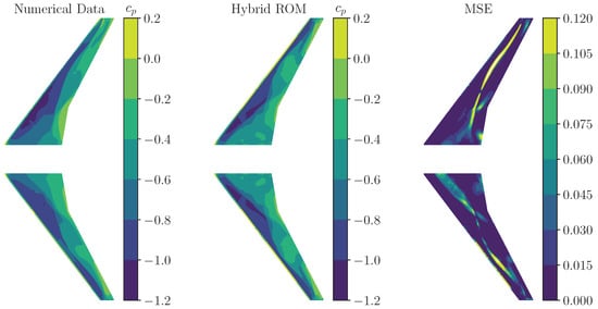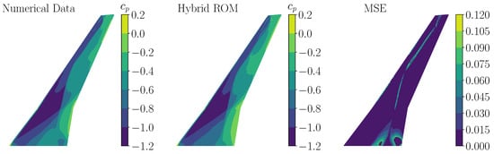 Therefore, an initial sequence including 32 -snapshots is presented to the trained model. As the prediction advances, the numerical data are successively replaced with predicted -snapshots. In Figure 18, a comparison between a numerical -snapshot (left) and the corresponding prediction of the hybrid ROM (middle) are visualized for the symmetric mode shape 11. Compared to the performance evaluation of the CNN-AE, slightly higher MSE values, especially at the position of the shock in the tip region, are indicated. However, the overall MSE on the wing is still sufficiently small.