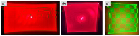 Figure 1. Rectangular (a), square (b), and checkerboard (c) Lissajous patterns generated by the resonant MEMS mirrors of the borescope prototype. Lissajous patterns were generated by the resonant MEMS and driven with a sinusoidal voltage of ±30 V; FOVs of approx. 28° × 59° (a) and 41° × 41° (b) were realized.
