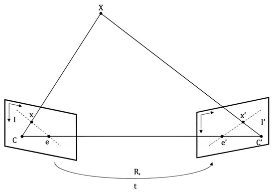 Figure 5. Epipolar geometry of a stereo vision system displaying the geometric details within the triangulation process of corresponding points in the camera images. (x, x’ = image points of X; C, C’ = camera centers; e, e’ = epipoles; R, t = transformation from camera center C to C’/between image planes.)