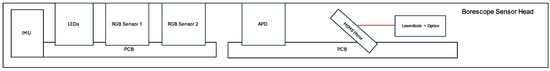 To implement the LiDAR, stereo vision, and laser triangulation measurement principles, the sensor head must incorporate the requisite electronic components. For stereo vision, two RGB sensors, along with LEDs for white light illumination, are integrated, as shown in Figure 6. The LiDAR setup includes an avalanche photodiode (APD) for detecting laser beams, which are emitted from a diode and directed by an optical system comprising lenses and a MEMS mirror. The equipment utilized for laser triangulation mirrors is also used for LiDAR and stereo vision measurements. Additionally, an Inertial Measurement Unit (IMU) is integrated to monitor the borescope head’s acceleration and rotation, as well as the temperature, to prevent overheating.