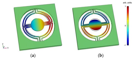 Figure 7. FEM simulations of perpendicular scanning modes for the designed MEMS mirror, (a) first perpendicular scanning mode, (b) second perpendicular scanning mode. The z-component of the displacement field is plotted in arbitrary units to highlight the respective mode shape. Reddish-colored areas correspond to displacements in a positive z-direction, while blue regions are displaced in a negative z-direction.