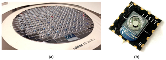 Figure 8. Photographs showing (a) a fully processed wafer stack and (b) a resonant MEMS mirror mounted on a PCB.