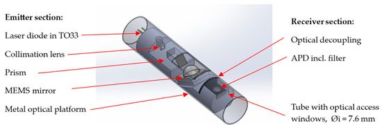 Figure 9. The CAD concept of the optical module, designed around a Øi = 7.6 mm tube with optical access windows, shows the emitter and receiver sections, including the locations of the assembled optical functional devices.