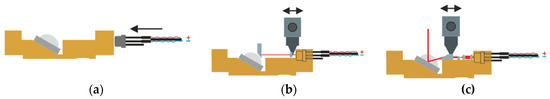 The assembly and focus setting procedures are executed using a FICONTEC precision pick-and-place machine equipped with an integrated laser controller and laser beam far field characterization capabilities. An assembly workflow was developed, as depicted in Figure 10, that starts with an assembly of the MEMS mirror followed by oriented insertion of the laser diode housing. The collimation lens is placed on a UV-adhesive bed and pre-applied in the mounting position, which is determined by laser beam far field characterization. Figure 11a illustrates the assembly process. The lens’s position is solidified by UV-LED illumination while it is held in place.