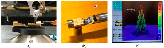 Figure 11. (a) Side view of the optical platform during the active lens alignment. The laser diode is powered by an increase in the laser driver feeding power from the right. The same connection lines are used to fine-tune the position of the laser housing using a separate XYZ robot. (b) Top view of the aligned laser diode, optics, and MEMS mirror on the framework. (c) Beam profile after the optical setup and reflection of the mirror.