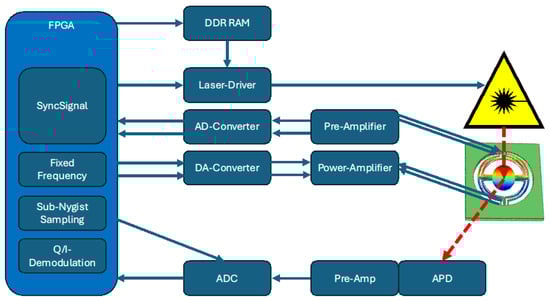 Figure 4 displays the emitted laser signal (blue), the reflected laser signal (orange), and the signal measured by the avalanche photodiode (APD) (red). The temporal shift between the blue and orange signals represents the travel time of the light from the laser diode to the APD. The APD is activated by the SNS ratio and captures the red data points. Utilizing these data, both the phase shift and the intensity are reconstructed, providing critical information for accurate distance measurement [29].