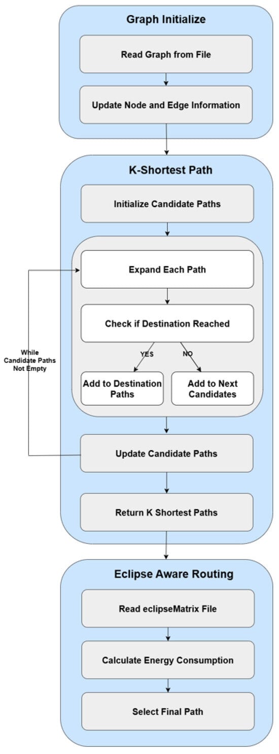 In this paper, a BFS-based KSP algorithm is combined with EAR to implement an efficient routing method for LEO satellite networks. The overall flow of the implemented algorithm is illustrated in Figure 1 and consists of three main stages: graph initialization, KSP search, and energy consumption calculation.