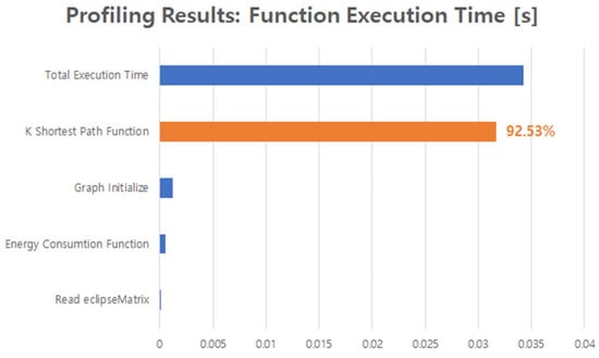 The performance evaluation results of applying this algorithm to an OBC simulating a LEO satellite network environment are presented in Figure 2. To analyze the execution time of the code, the number of satellites was set to 150, and the number of shortest paths to search (K) was set to 15 for profiling. The analysis revealed that the KSP search process accounted for 92.53% of the total execution time. In contrast, the graph initialization and energy consumption calculation processes incurred relatively lower computational costs.