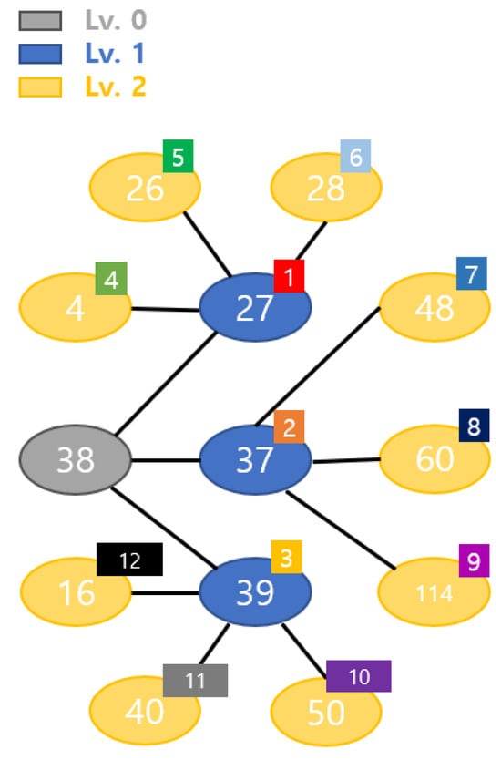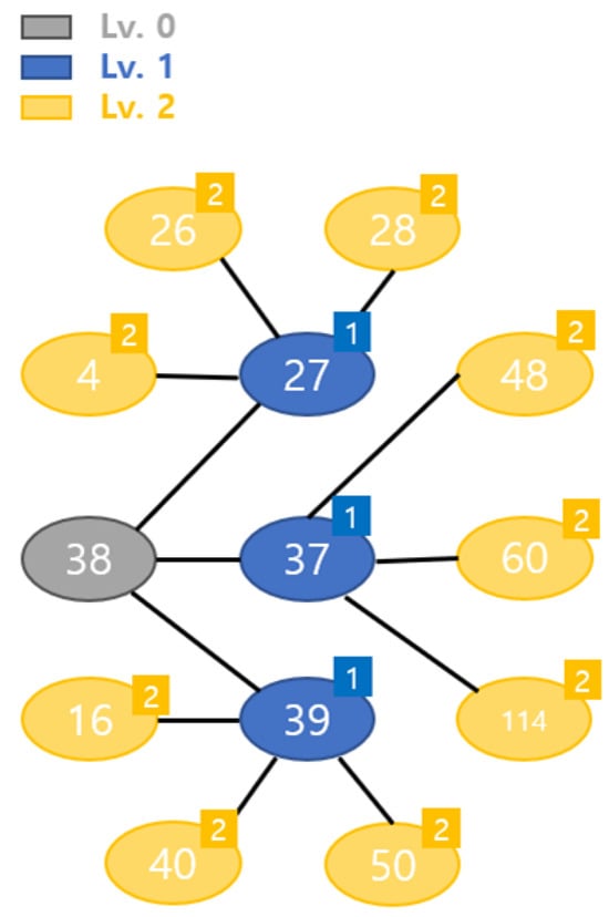To provide a clearer explanation of the BFS-based KSP search process, Figure 3 is used to analyze the path exploration procedure, representing a portion of the actual graph used in this study’s experiments. The gray node represents the starting node where the search begins, assigned as level 0, while the blue nodes indicate adjacent nodes expanded in the first step, corresponding to level 1. The yellow nodes represent nodes further expanded in the second step, forming candidate paths to the destination, with the numbers in the upper right corner of each node denoting the order in which they were explored. In BFS-based search, the exploration expands level by level from the starting node, forming paths while preventing cycles to ensure optimal route selection. Due to the nature of BFS, all possible paths are explored while expansion occurs based on the shortest distance, making it an efficient method for finding the K shortest paths.