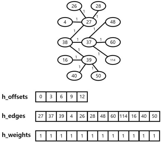 In the CSR format, a graph is stored using three arrays, as illustrated in Figure 4. The h_offsets array stores the starting position of each node’s adjacency list, allowing quick determination of where a specific node’s adjacency list begins in the h_edges array. The h_edges array contains all adjacency lists in a contiguous format, storing the destination nodes of all edges, so scanning from h_offsets[i] to h_offsets[i + 1] enables efficient retrieval of all adjacent nodes for a given node. The h_weights array, maintaining the same order as h_edges, stores the edge weights, ensuring quick access to the weight information corresponding to each adjacent node. By applying CSR transformation, the memory inefficiencies and challenges of parallel search encountered in the traditional adjacency list method are resolved, enabling fast and optimized path searching in a GPU environment.