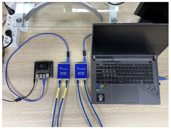 In this paper, experiments on satellite network routing were conducted using CUDA-based KSP search and the EAR algorithm. The overall structure of the experimental setup is illustrated in Figure 7, while Figure 8 shows the actual equipment used in the experiment. The experimental environment consisted of an OBC device with both CPU and GPU, two SpaceWire Brick Mk4 devices, and a PC utilizing only a CPU.