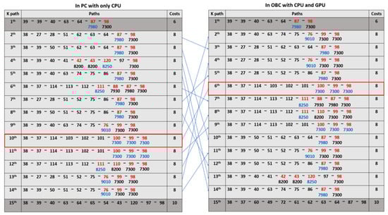 Figure 9 presents the experimental results obtained in PC with only CPU and OBC with CPU and GPU environments. The table on the left shows the results from the PC with only CPU, while the table on the right displays the results from the OBC with CPU and GPU. The first path, which has a cost of 6, is identical in both environments. However, it can be observed that the ordering of paths with a cost of 8 differs between the two implementations. This discrepancy arises due to implementation-specific factors, but as indicated by the arrows in the center of the figure, the candidate paths remain the same, ensuring correctness. To rigorously verify that both environments yield identical results, an exhaustive evaluation was conducted for all paths with a cost of 8 using the K-shortest path (KSP) algorithm. Similarly, for paths with a cost of 10, the ordering difference can result in a variation in the 15th path. The EAR algorithm is applied after extracting the top K shortest path candidates through KSP exploration.
