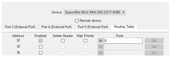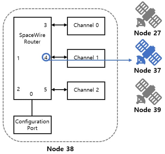 Figure 11 provides an overview of the internal structure of the SpaceWire Brick Mk4 device. The integrated SpaceWire router features a total of six ports, with port 0 designated as the configuration port and thus unavailable for use. This leaves five selectable ports for experimentation. In this study, port 4 was assumed to be connected to node 37, and the routing table of the remote device was modified to direct traffic through port 4 according to the EAR algorithm’s results.