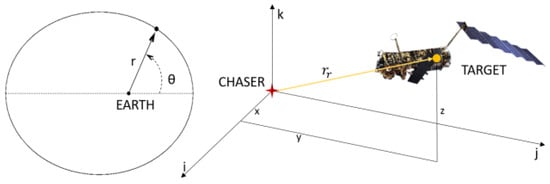 The target, ENVISAT, has its relative translational dynamic equations developed with respect to the local-vertical–local-horizontal (LVLH) frame of the chaser. The target relative position, denoted as , and relative velocity, , are defined in the chaser LVLH frame, expressed as follows: