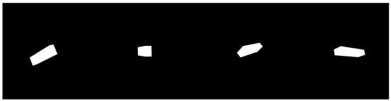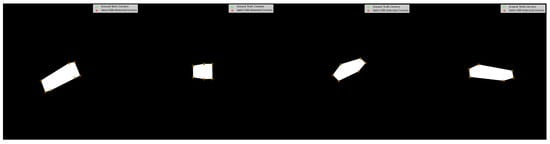 Detailed models of the satellite’s orientation and movement patterns, replicating the complex dynamics encountered in orbit, are simulated in this section. By leveraging computational tools, we were able to create accurate ground truth data for both the pose and marker locations on the satellite by propagating the equations of motion of the chaser and target satellites using the Runge–Kutta–Fehlberg method. This simulation process was critical for establishing a reliable dataset that mirrors the real-world conditions the satellite would experience in space. Figure 2 visualizes the ENVISAT satellite and its geometrical dimensions used within the simulation environment (commas are decimal separators). The European Space Agency online sources provide details about ENVISAT’s mass, the location of its center of mass, and its moments of inertia, as well as its geometric center and volume []. Figure 3 shows the series of simulated images for the ENVISAT satellite as follows. Note that the solar panel is not included in the simulation, but the main rectangular body is modeled for assessing the accuracy of the corner detection algorithm and verification. The state vector that has 12 components (the relative position between target and chaser centers of mass, relative velocity of the center of mass, MRPs for attitude, and angular velocities) and the true measurement of all the corner locations (which would be the ground truth for the corner detection algorithm) are stored after each simulation.