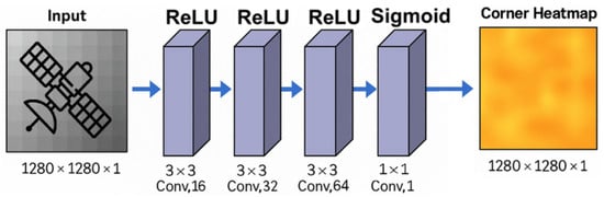 In this work, the chosen neural network model is our lightweight CNN architecture design, named TinyCornerNET, developed specifically for structural marker detection on the ENVISAT satellite. Unlike more complex networks such as L-CNN [] or stacked hourglass models, TinyCornerNET is optimized for efficiency and simplicity, making it highly suitable for real-time applications in spaceborne systems with limited computational resources. TinyCornerNET consists of a series of convolutional layers with ReLU activations and a final sigmoid-activated convolutional output layer to predict a likelihood map of marker positions. The detailed architecture is given in Figure 5, and the parameters are summarized in Table 1. Note that it is trained with 100 random simulated images.