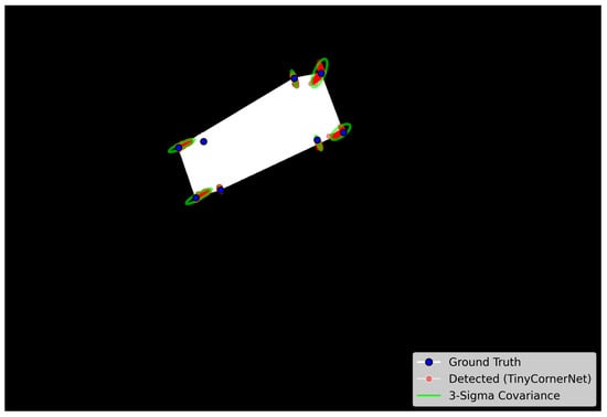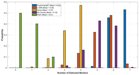 TinyCornerNET outputs a heatmap representing the probability of marker locations in the image. A dynamic threshold based on the maximum heatmap intensity is applied to identify candidate corners. Non-Maximum Suppression (NMS) is then used to eliminate redundant detections, retaining only the most probable marker positions. The performance of TinyCornerNET marker detection is compared against traditional corner detection methods such as Harris [], Shi-Tomasi [], and FAST []. As shown in Figure 6, TinyCornerNET demonstrates superior reliability, detecting a higher number of markers across a variety of conditions, including noisy and blurred imagery. The performance results reported in the histogram are based on a complete simulation composed of 6035 simulated images, with the addition of mild black-pepper noise and affine translation-rotation that mimics the behavior of camera movements on a dynamic platform, like shaking, vibrating, or rotating, which are counted as external disturbances.